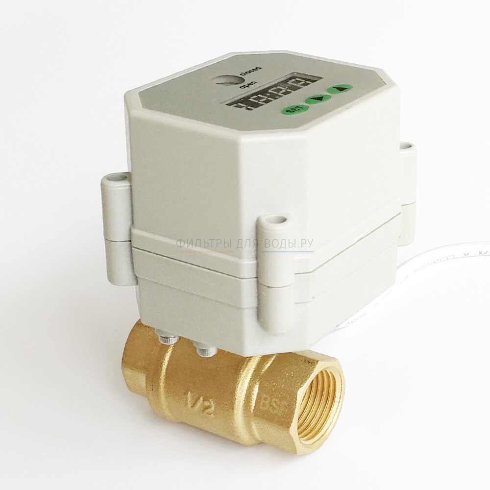 Программируемый шаровой кран с электроприводом для организации автоматической промывки сетчатых фильтров. Подключаетсяк промывному отверстию сетчатого фильтра через разъёмное латунное соединение для удобства демонтажа и обслуживания сетки фильтра. Программные настройки позволяют настроить к длительность времени между промывки, так длительность открытия шарового крана при промывке. Максимально возможный временной интервал между промывками составляет 100 часов.