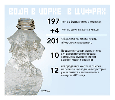 Вслед за студенческим объединением университета Торонто, студенческий союз университета Йорка начал кампанию "Кампус, свободный от бутилированный воды". Студенты надеются постепенно отойти от использования пластиковых бутылок на территории кампуса.