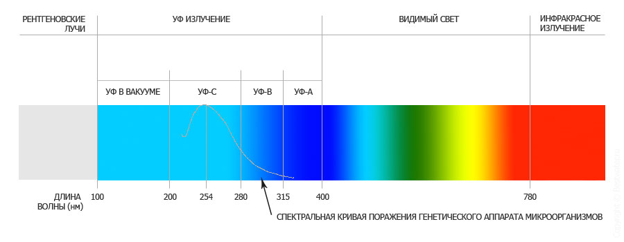 На микроуровне ультрафиолетовые лучи активизируют фотохимические процессы, приводящие к физическому разрушению клеточных мембран микроскопических организмов. Бактерии и вирусы при этом не просто угнетаются, а перестают существовать, поскольку разрушительные процессы, вызванные УФ-излучением, для них необратимы.